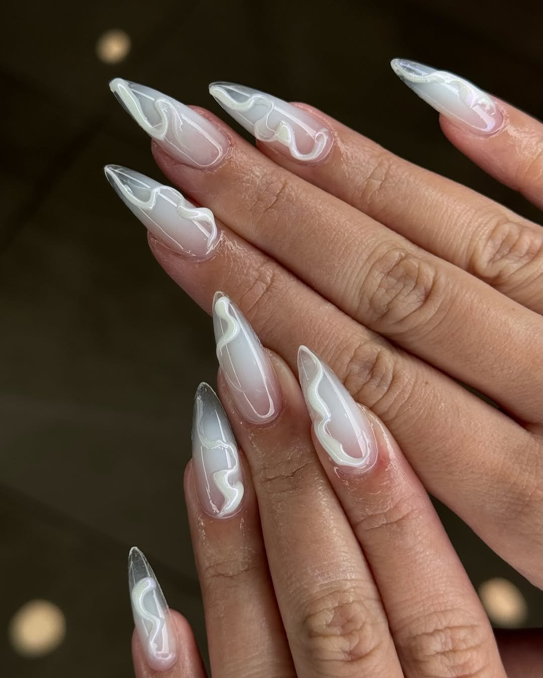 Translucent grey-white tones swirl across long almond nails in soft, smoky waves. The subtle contrast between sheer and opaque creates dimension without needing sparkle.