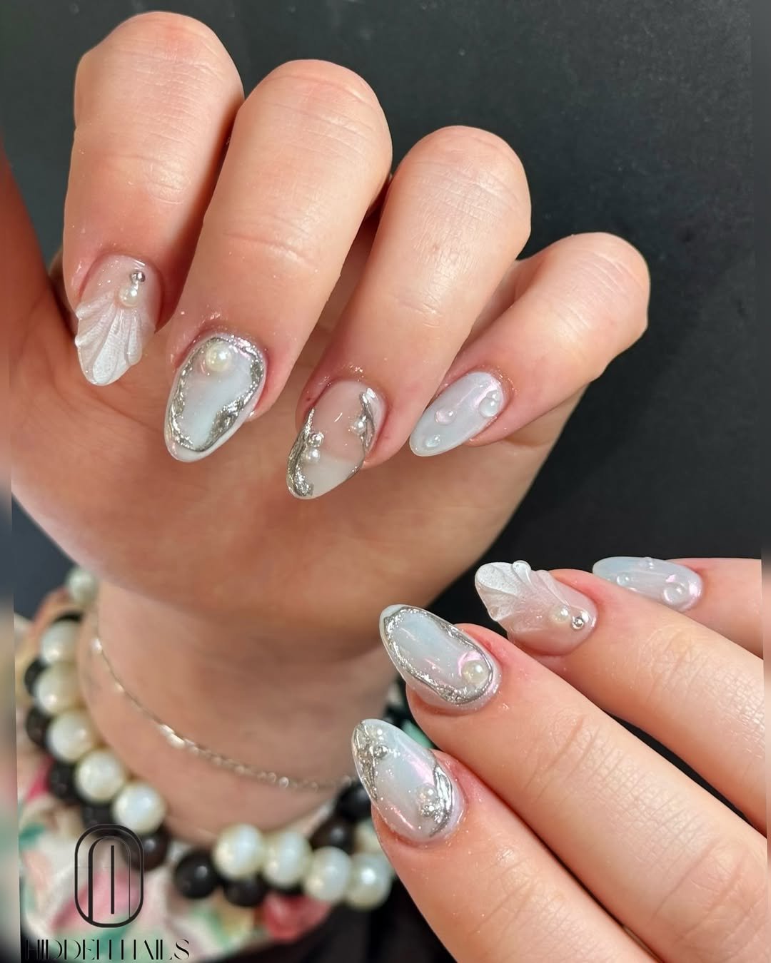 Short almond nails get a dreamy upgrade with sheer milky white, chrome edging, and pearl accents that catch the light in the prettiest way.