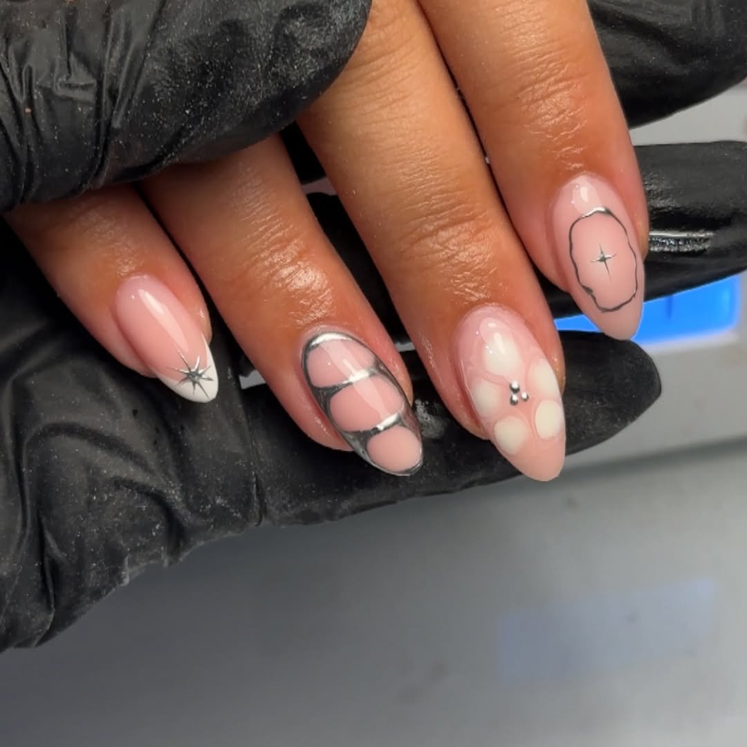 Soft nude bases layered with crisp white swirls and tiny silver studs create a light, airy design that still feels polished.