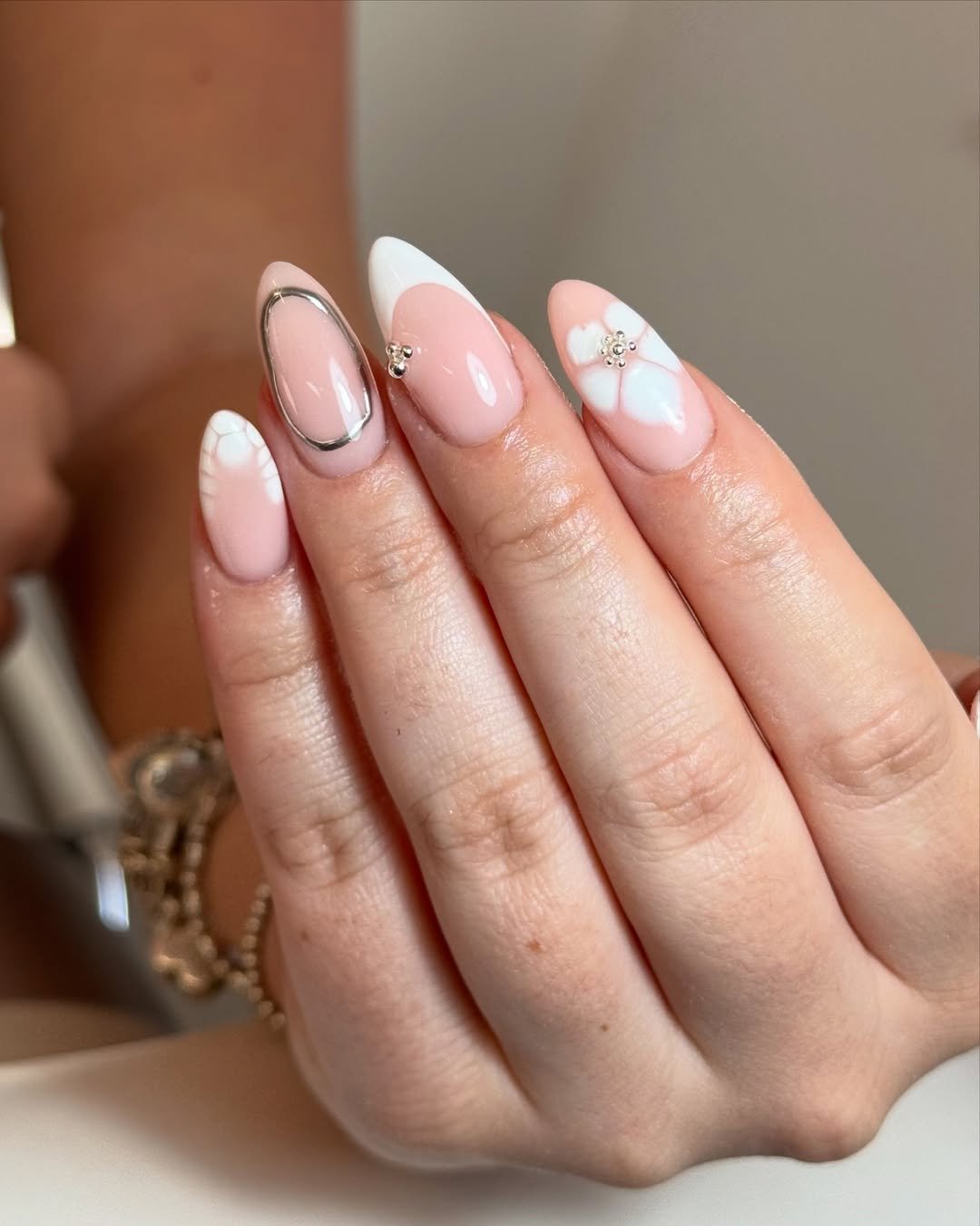 A blush base paired with sculpted white petals feels romantic without veering sugary. One nail is framed in chrome silver, another blooms into a soft floral accent with a crystal center that catches the light just right.