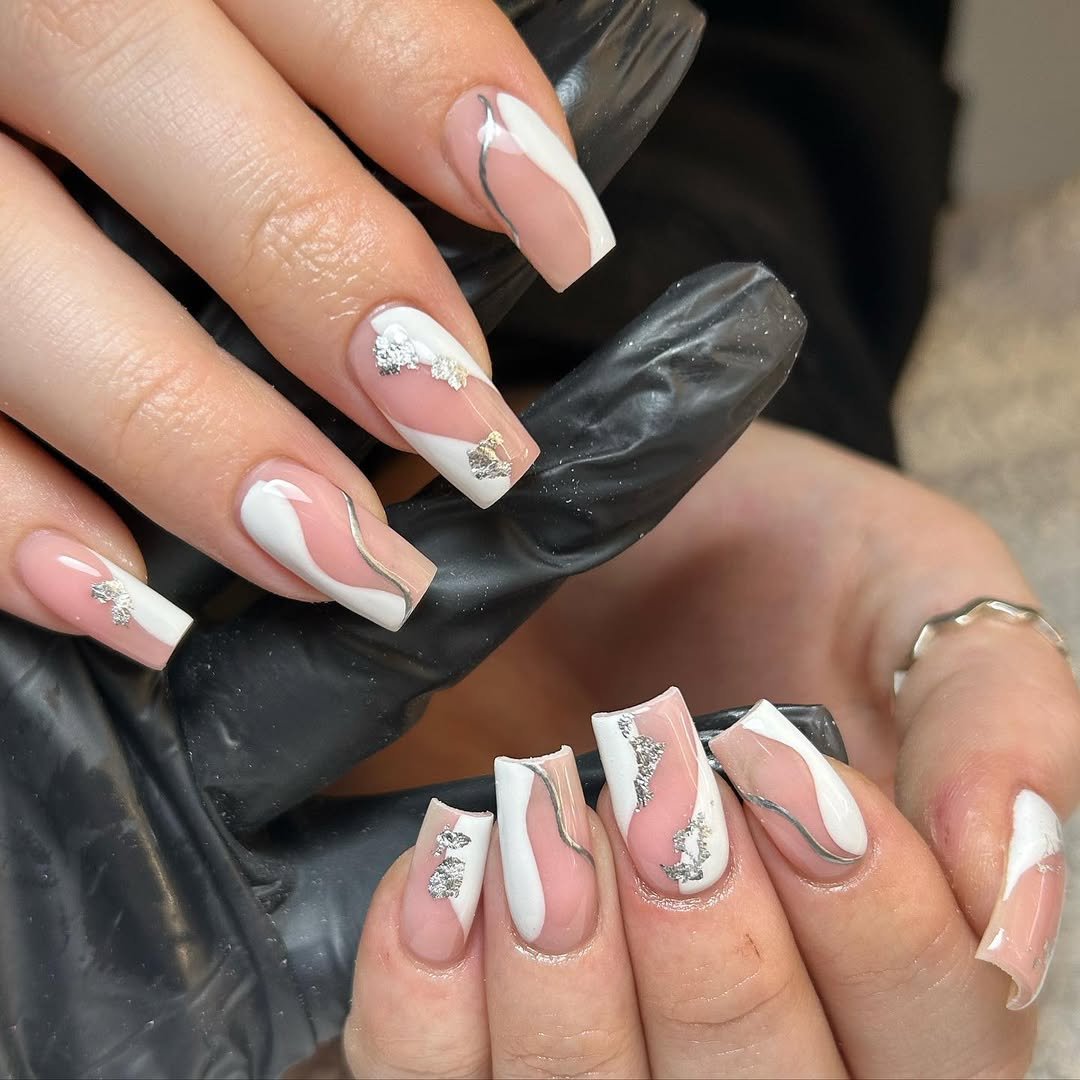 Clean white tips meet soft nude panels, accented with silver foil and delicate curved lines that feel almost architectural. The design plays with negative space in a way that feels modern and balanced.