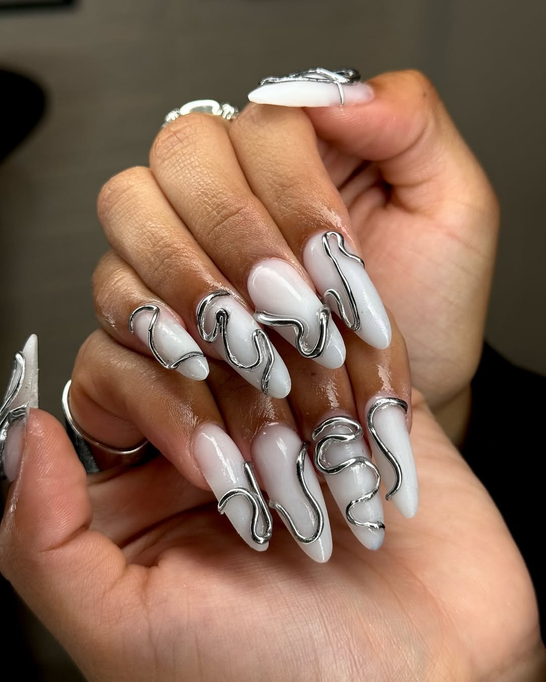 Now this is texture. Glossy white nails wrapped in raised chrome lines that curve like silver ribbons across each finger.