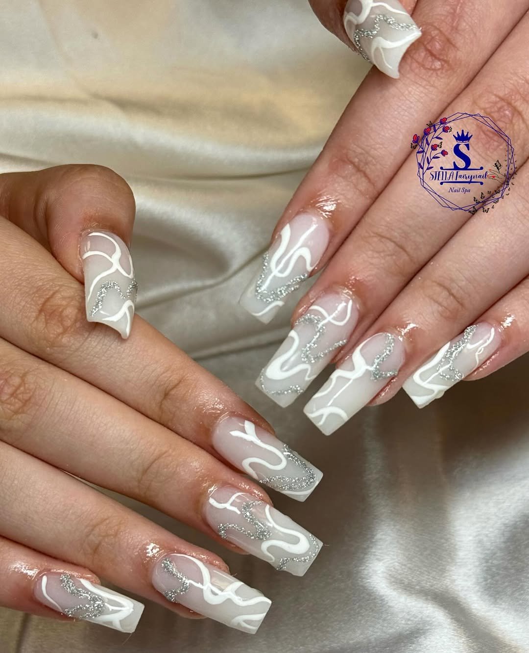 These milky square tips feel like satin ribbon caught in motion. Soft white swirls dance across a sheer nude base, while fine silver glitter traces the curves like frost on glass. There’s something almost bridal about it, but not in a predictable way. It feels modern, polished, and ready for a candlelit dinner or a winter engagement party.