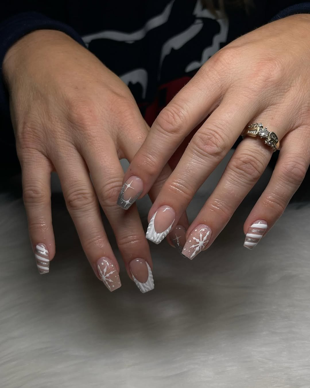 A mix of glitter-tipped French, delicate snowflake art, and curved silver lines makes this design feel cozy and seasonal.