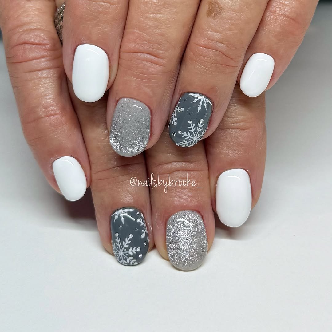 Short, rounded nails in crisp white meet soft grey and fine silver glitter. The delicate snowflake art adds just enough detail without overpowering the clean design.