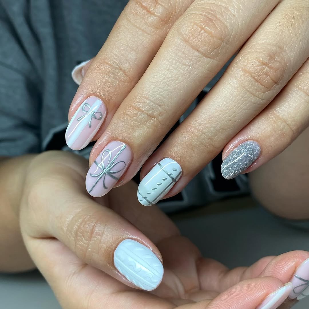 There’s something so charming about this pastel-leaning white and silver mix. Delicate bows, sweater-inspired textures, and fine silver lines give it a playful but polished finish.