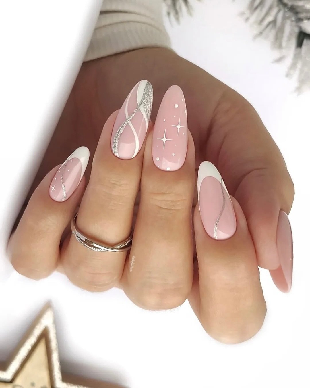 Long almond nails in soft blush and white get elevated with sweeping silver swirls and tiny star accents.