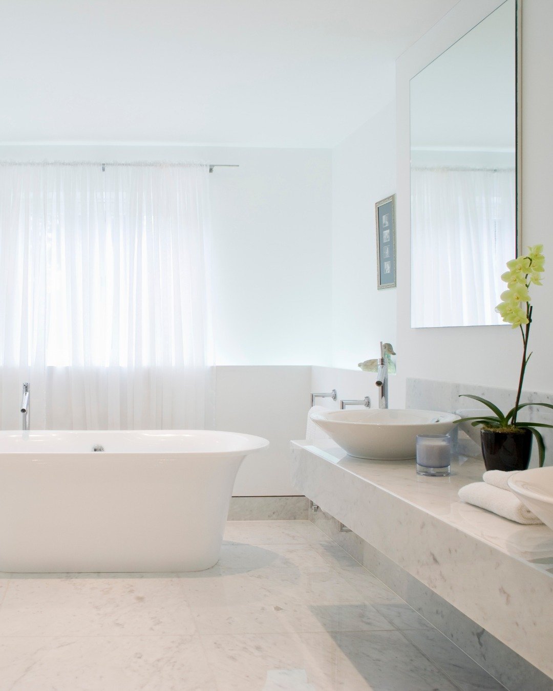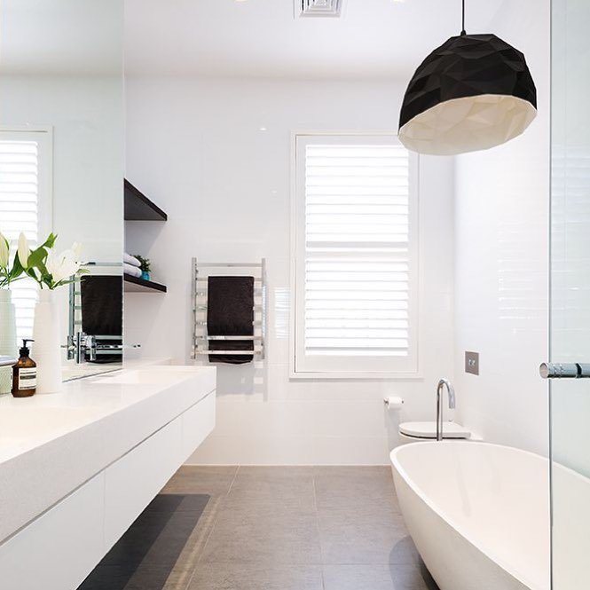 This one is all about light. The all-white marble look reflects everything, making the space feel bigger, brighter, and more open.