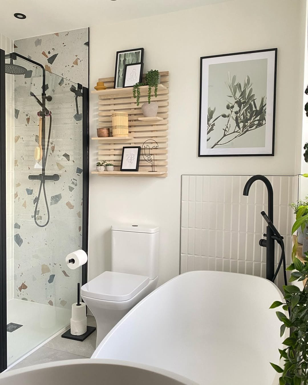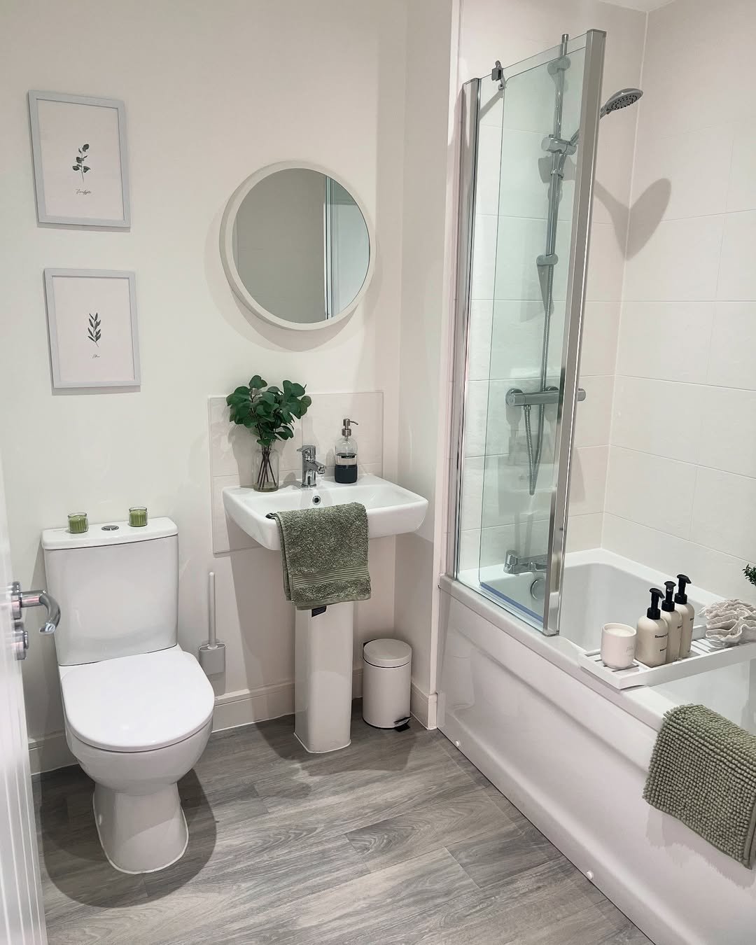 This one leans into simplicity in the best way. Clean white walls, soft grey flooring, and just a touch of greenery to keep it from feeling flat.
