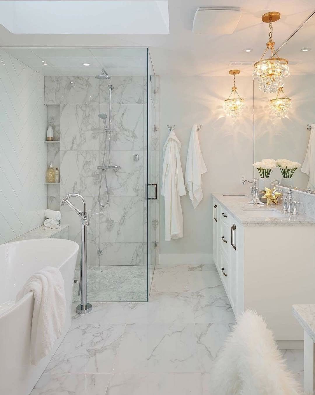 This one feels straight out of a boutique hotel. The marble-on-marble look paired with those sparkling chandeliers adds just the right amount of glam without overpowering the space.