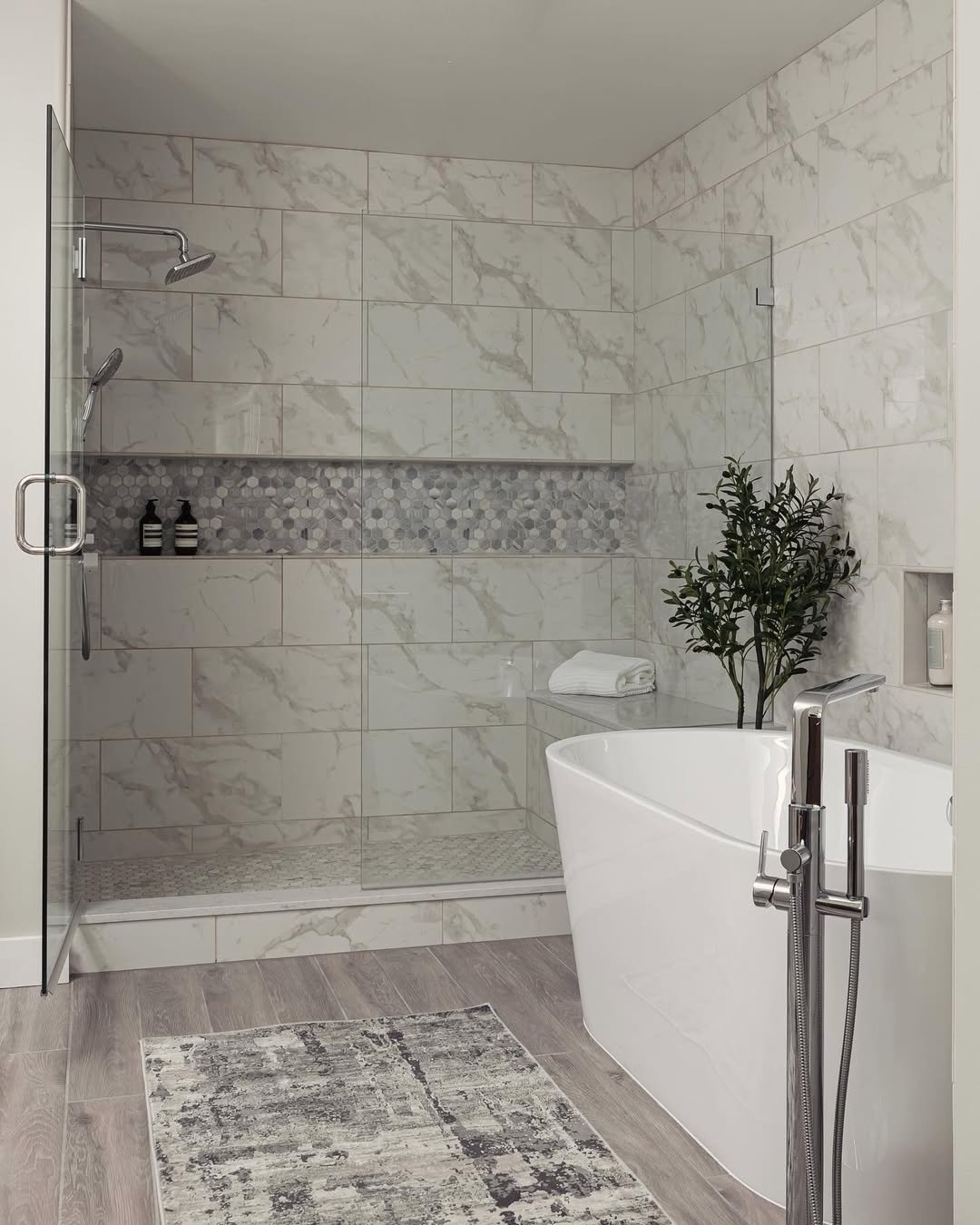 Everything here is crisp and perfectly aligned. The glass shower, built-in niche lighting, and soft grey veining create a super polished, modern vibe.