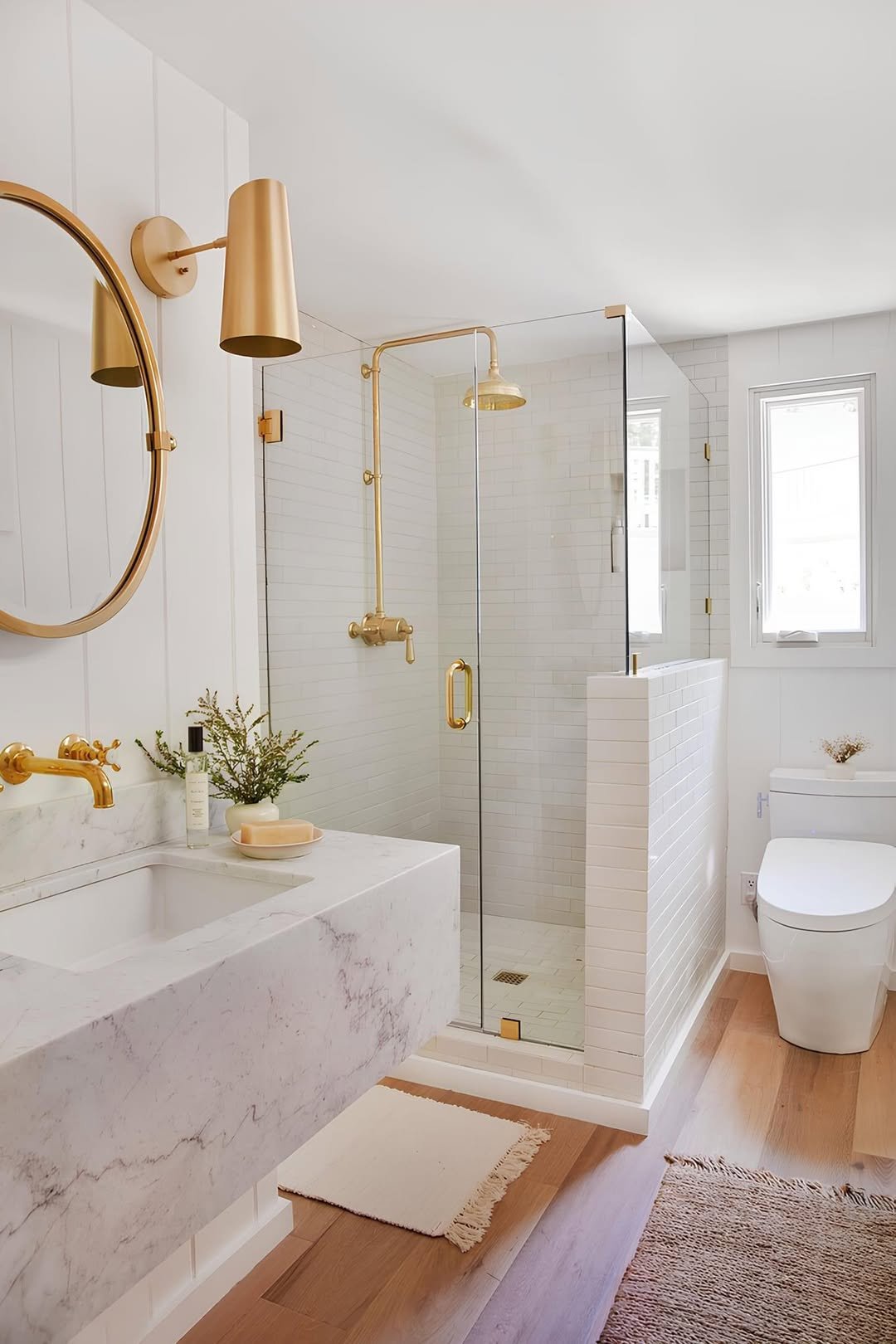 White and gold just hits differently. The sleek marble sink paired with those gold fixtures adds a polished, high-end feel without going overboard.