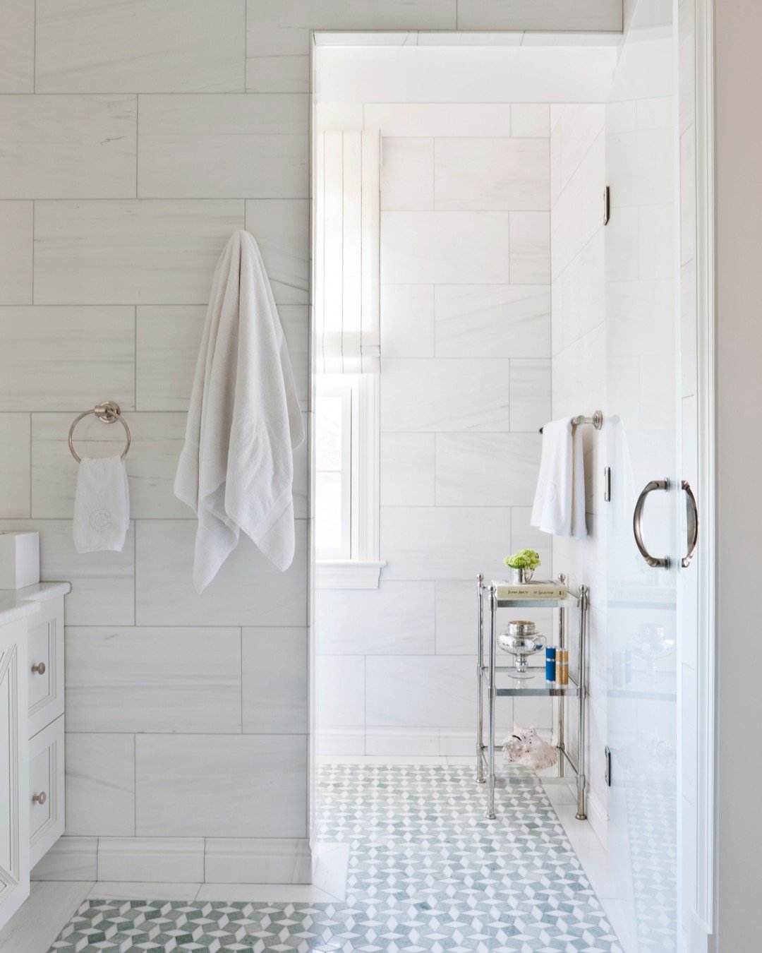 At first glance it’s all white—but then that floor pulls you in. The subtle pattern adds personality while keeping everything cohesive.