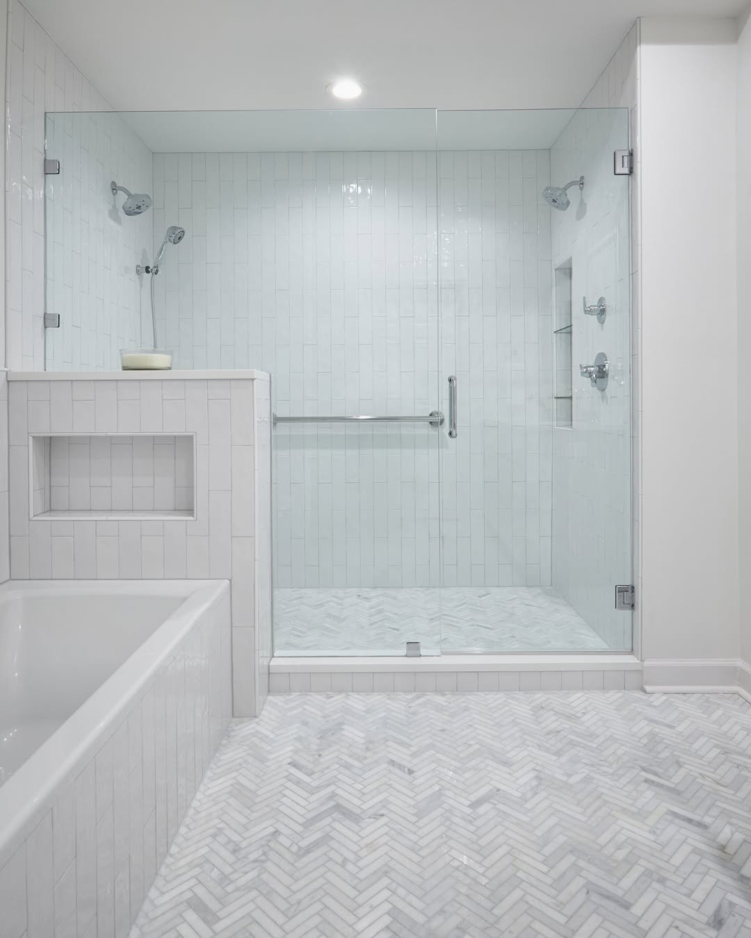 This bathroom leans fully into texture over color. The subtle tile patterns—from vertical walls to herringbone floors—add depth without breaking the white palette.