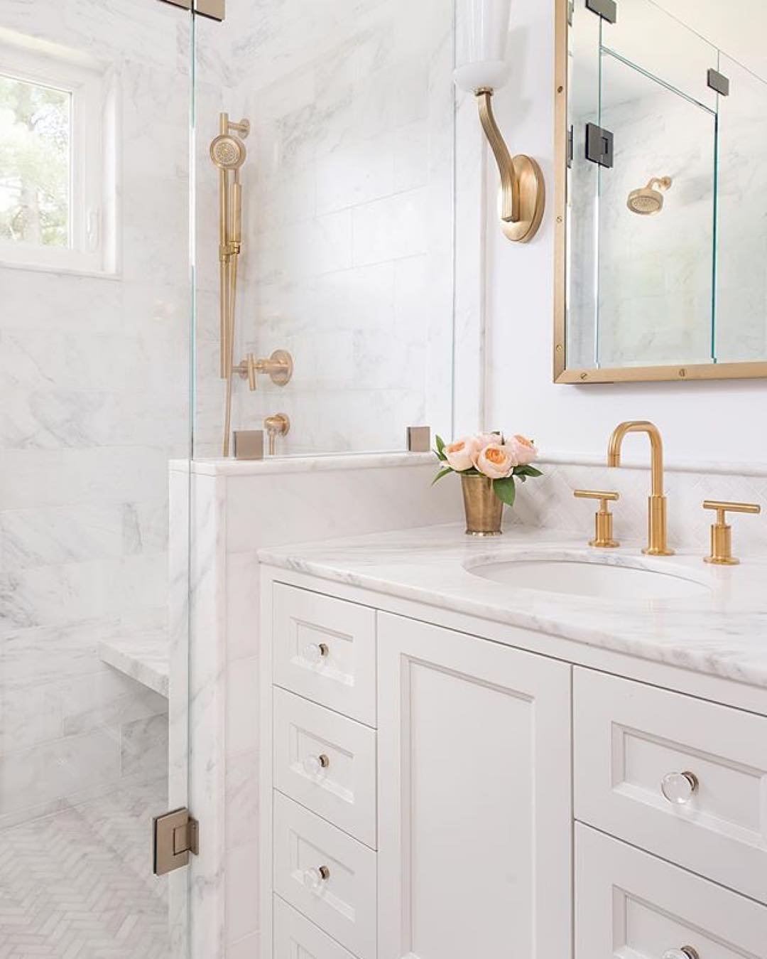 There’s something about gold fixtures on crisp white that always hits right. The warm brass details instantly elevate the entire look without overwhelming it.