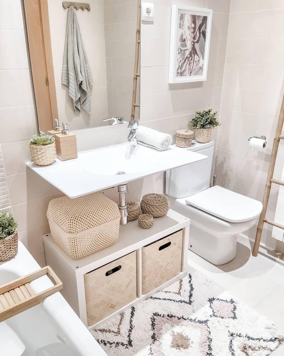 This one leans soft and homey. The woven basket, light wood accents, and neutral tones bring warmth into the all-white base.