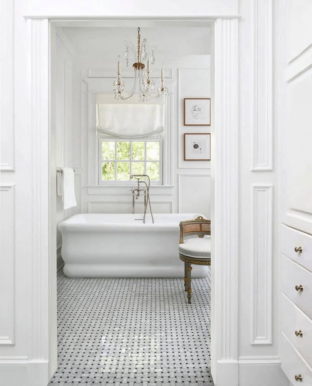 This one leans fully into classic elegance. The freestanding tub, detailed wall paneling, and chandelier lighting give it that almost vintage, luxury feel.