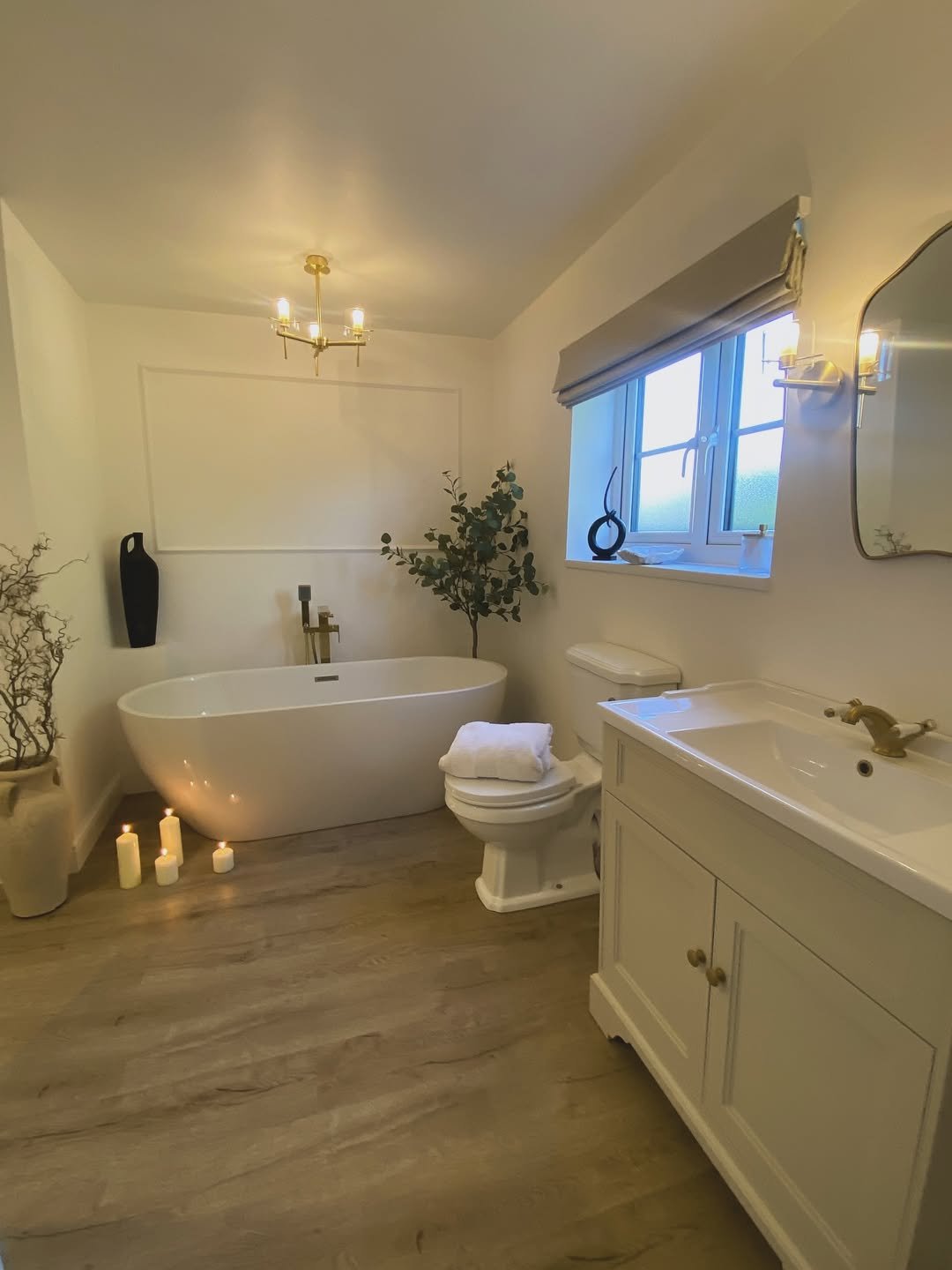 This one is all about the details. The brass fixtures, soft lighting, and clean cabinetry create a refined, slightly vintage-inspired feel.