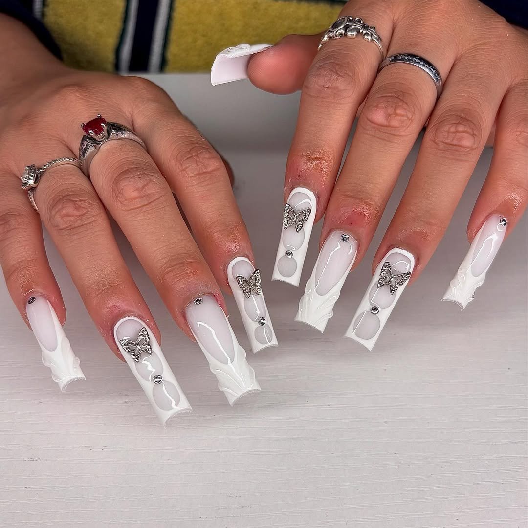This set blends soft white structure with sheer cutouts and metallic butterfly charms. There’s texture, shine, and just enough drama to turn heads.