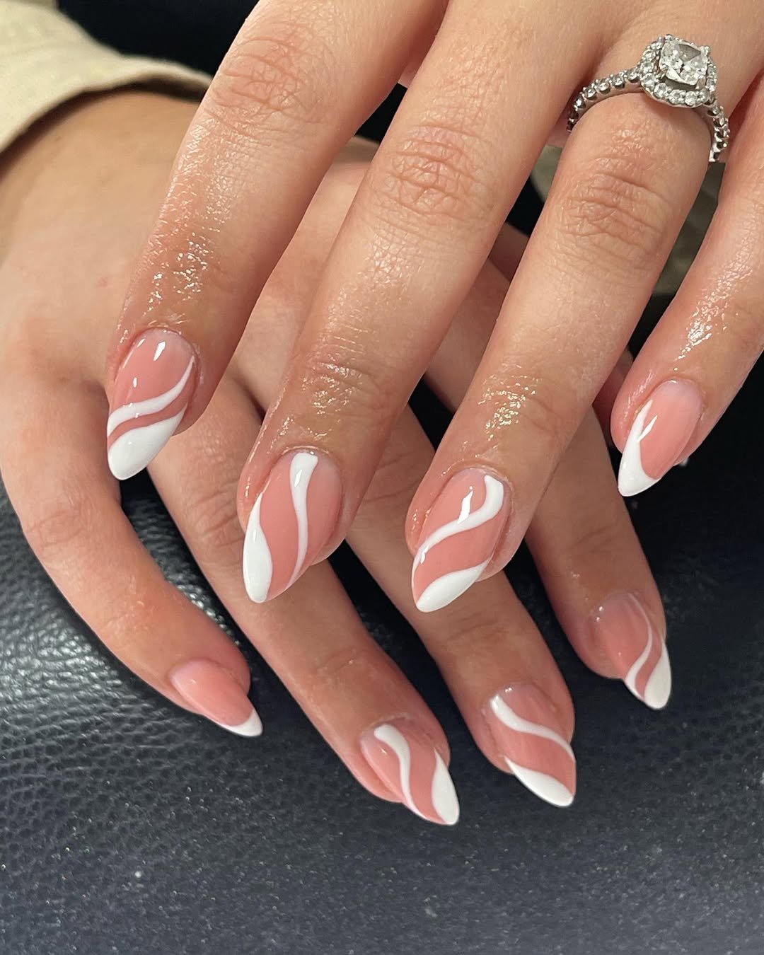A modern take on the French tip with soft white swirls flowing over a nude base. It’s delicate but still eye-catching.
