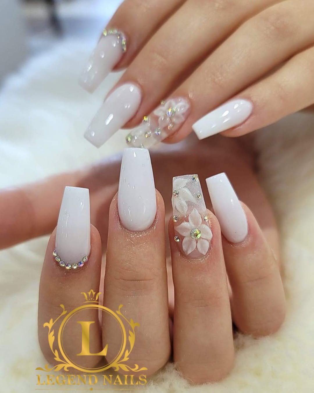 This milky white set is soft, glossy, and straight-up bridal goals. The subtle ombré base keeps it dreamy, while the 3D floral accent and tiny rhinestone arcs add just enough sparkle to feel luxe.
