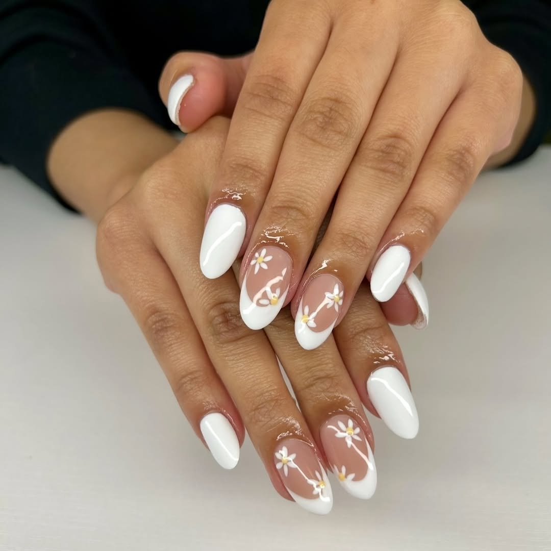 Classic white French tips meet tiny hand-painted daisies on a glossy nude base. It’s sweet, fresh, and totally wearable.