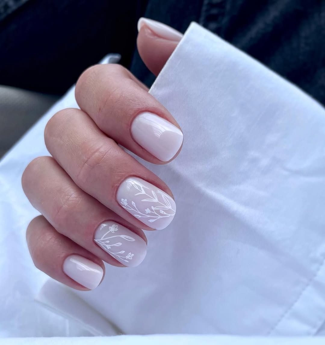 Short, soft white nails with fine botanical line art feel effortlessly chic. No heavy embellishments, no overthinking—just clean design.