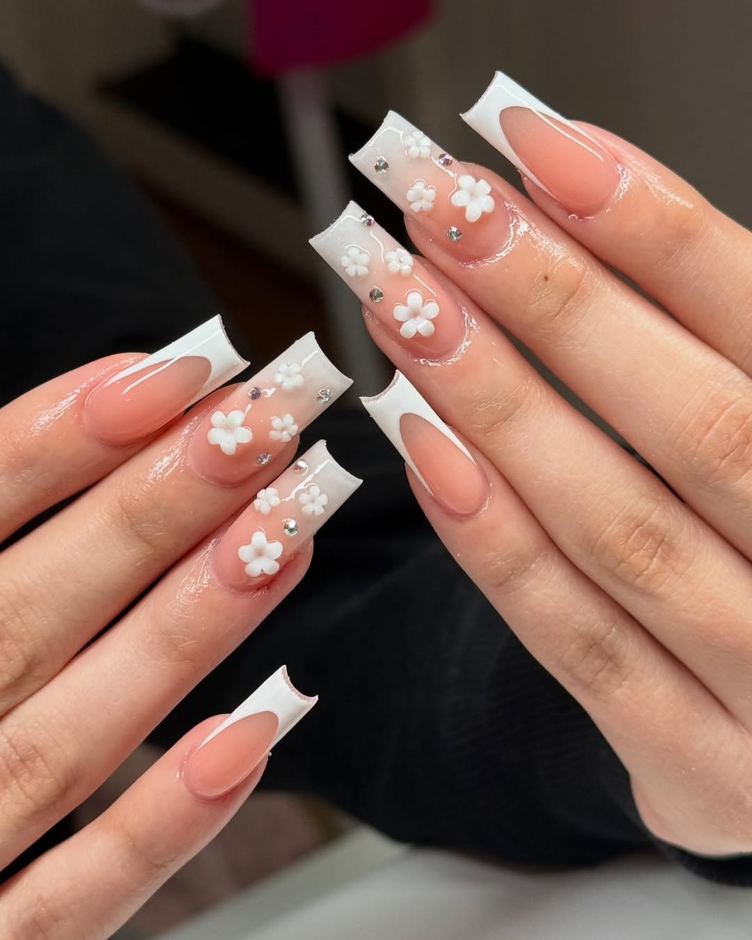 Soft square French tips meet tiny 3D white flowers and scattered crystals. It’s giving spring bride, engagement shoot, or “I just like feeling pretty on a Tuesday.”