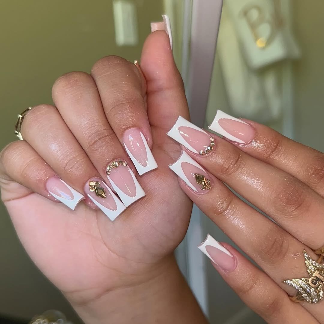 This set plays with bold white French framing and negative space in the center, finished off with gold gems for a little edge.