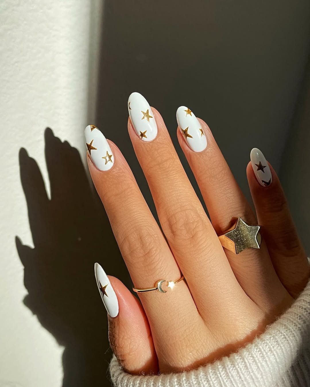 Milky white almond nails sprinkled with tiny gold stars? Say less. The simplicity is what makes it powerful.