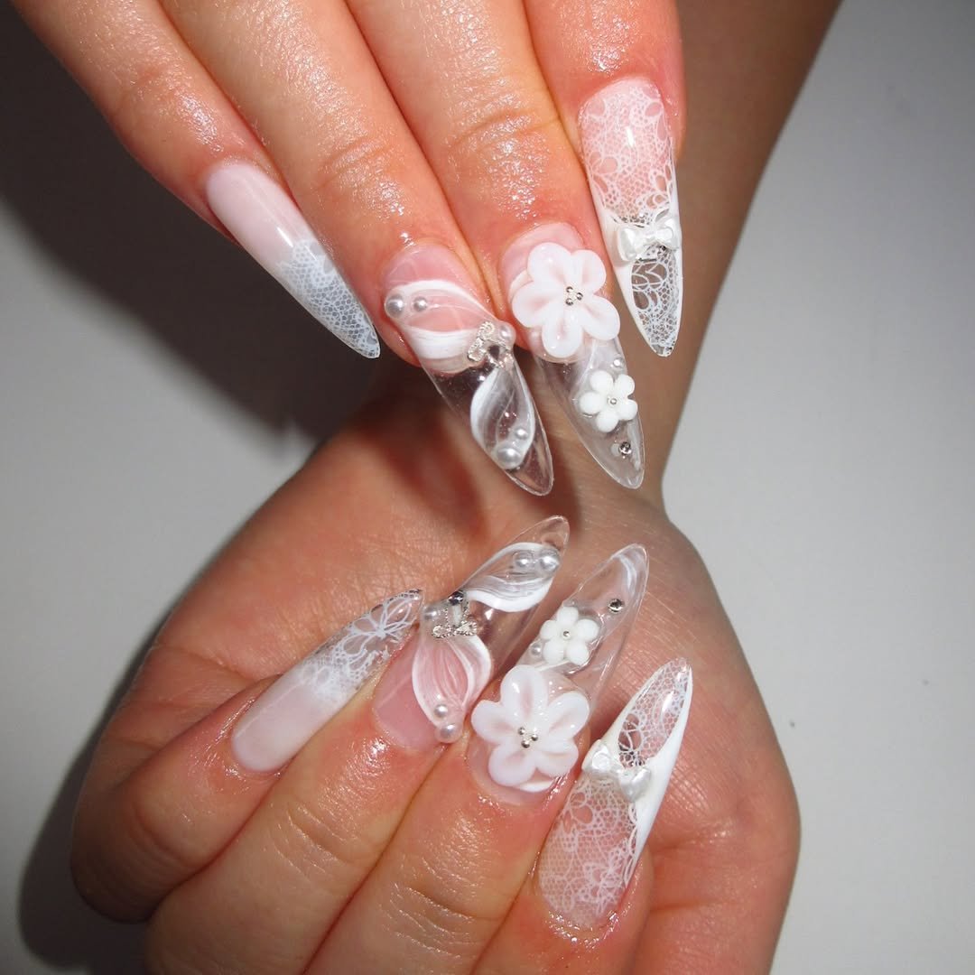 Clear stiletto tips, delicate lace art, 3D flowers, pearls—this set is full bridal couture energy. Every nail has its own moment, but somehow it all flows together.