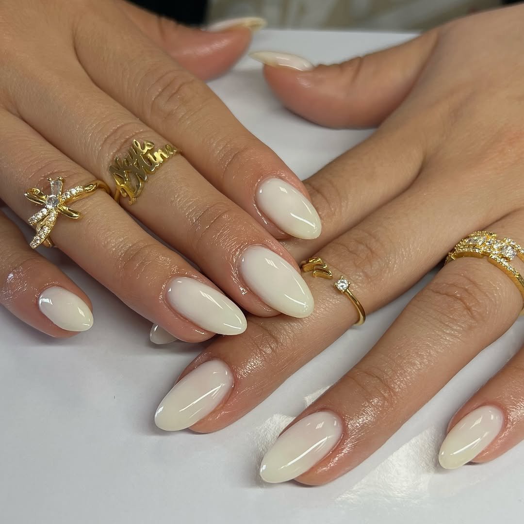 Soft, creamy almond nails with a smooth glossy finish—no art, no crystals, just flawless shaping.