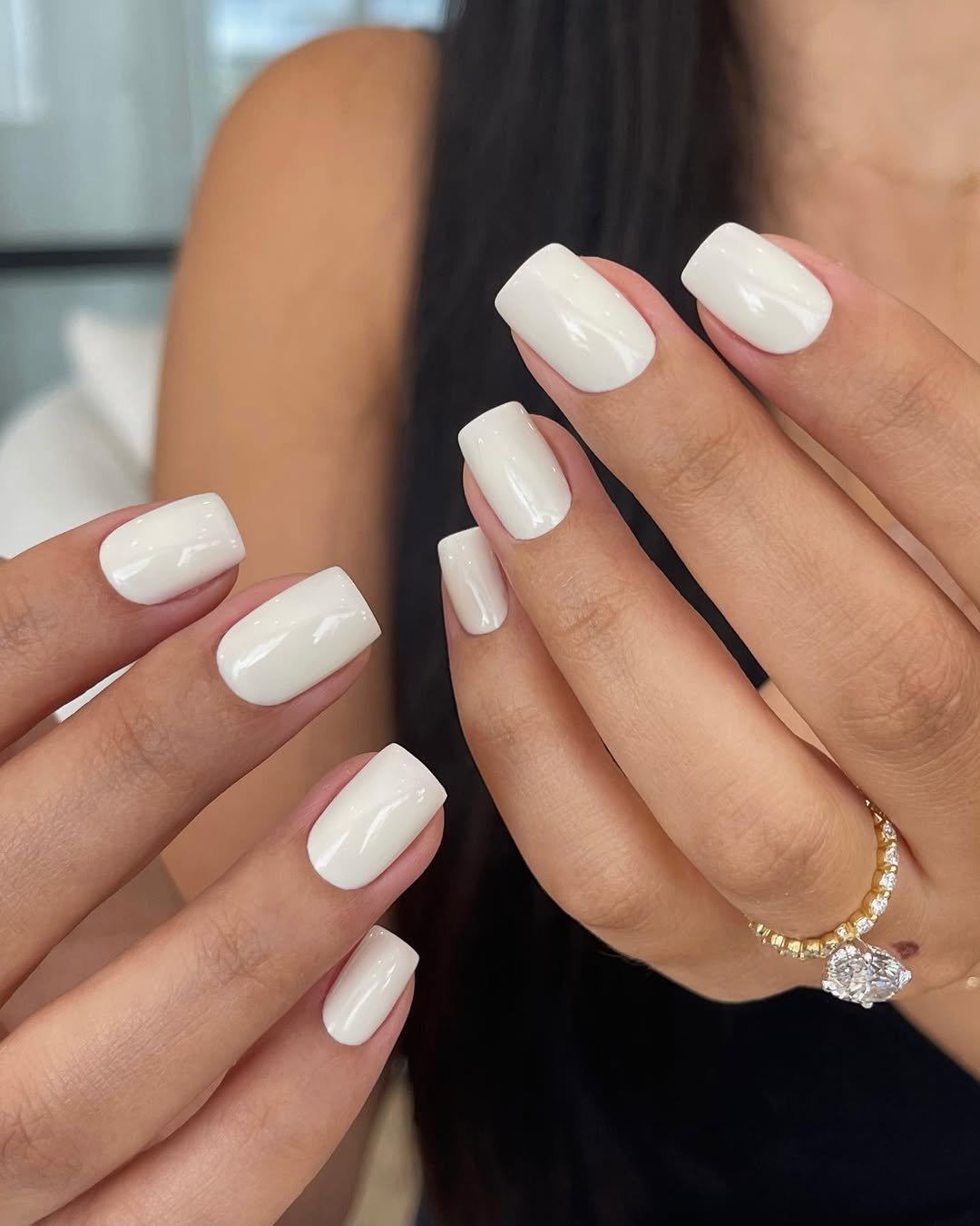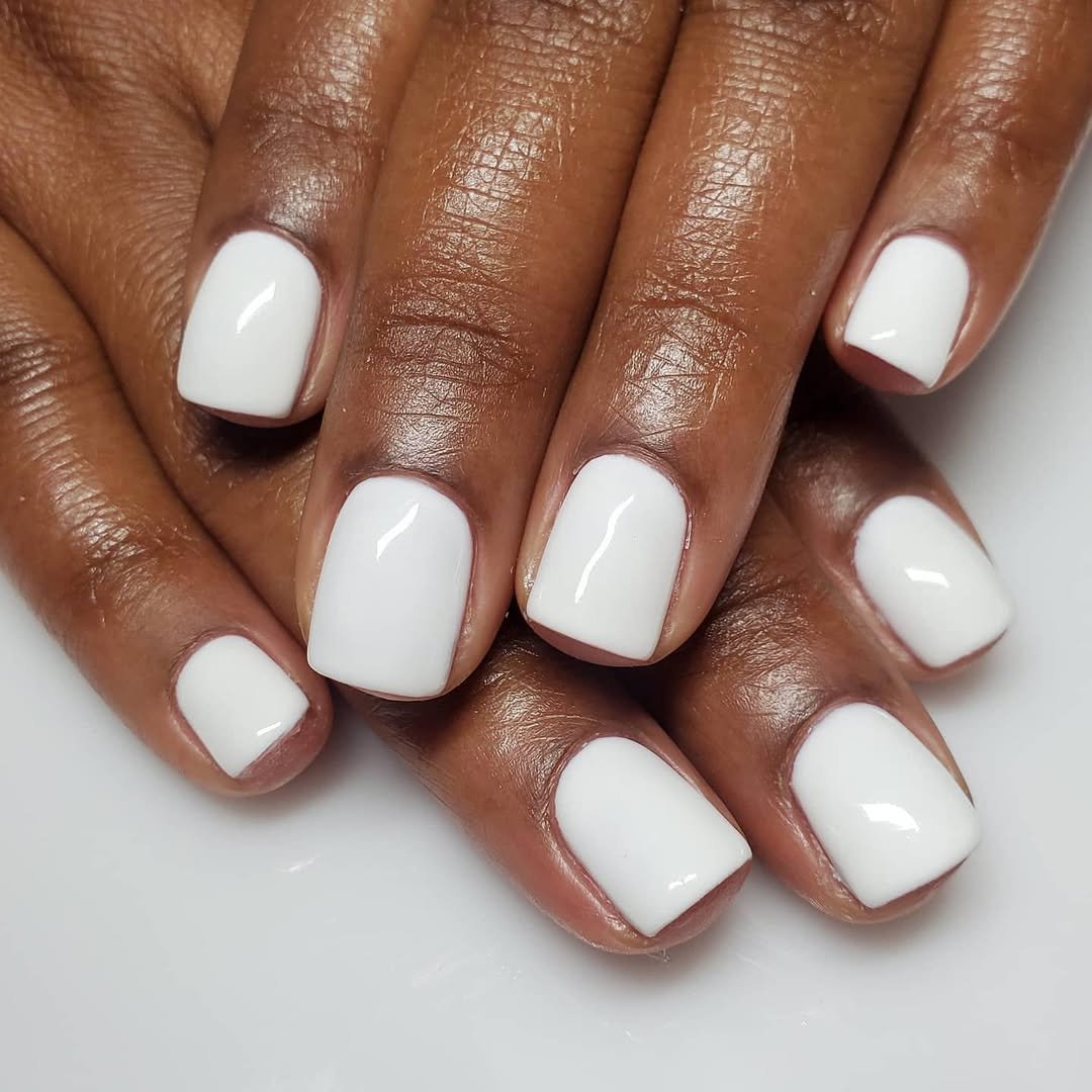 Short square nails in a pure, bright white that looks fresh and ultra clean on deeper skin tones.