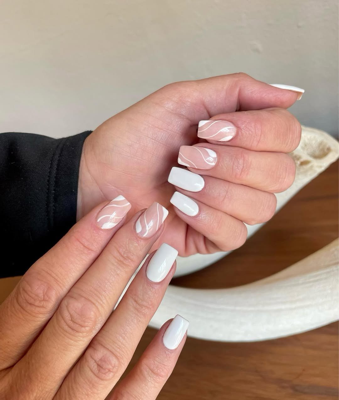 Clean square whites meet soft nude accent nails with flowing white wave lines. It’s simple, but the detailing gives it that quiet designer feel.