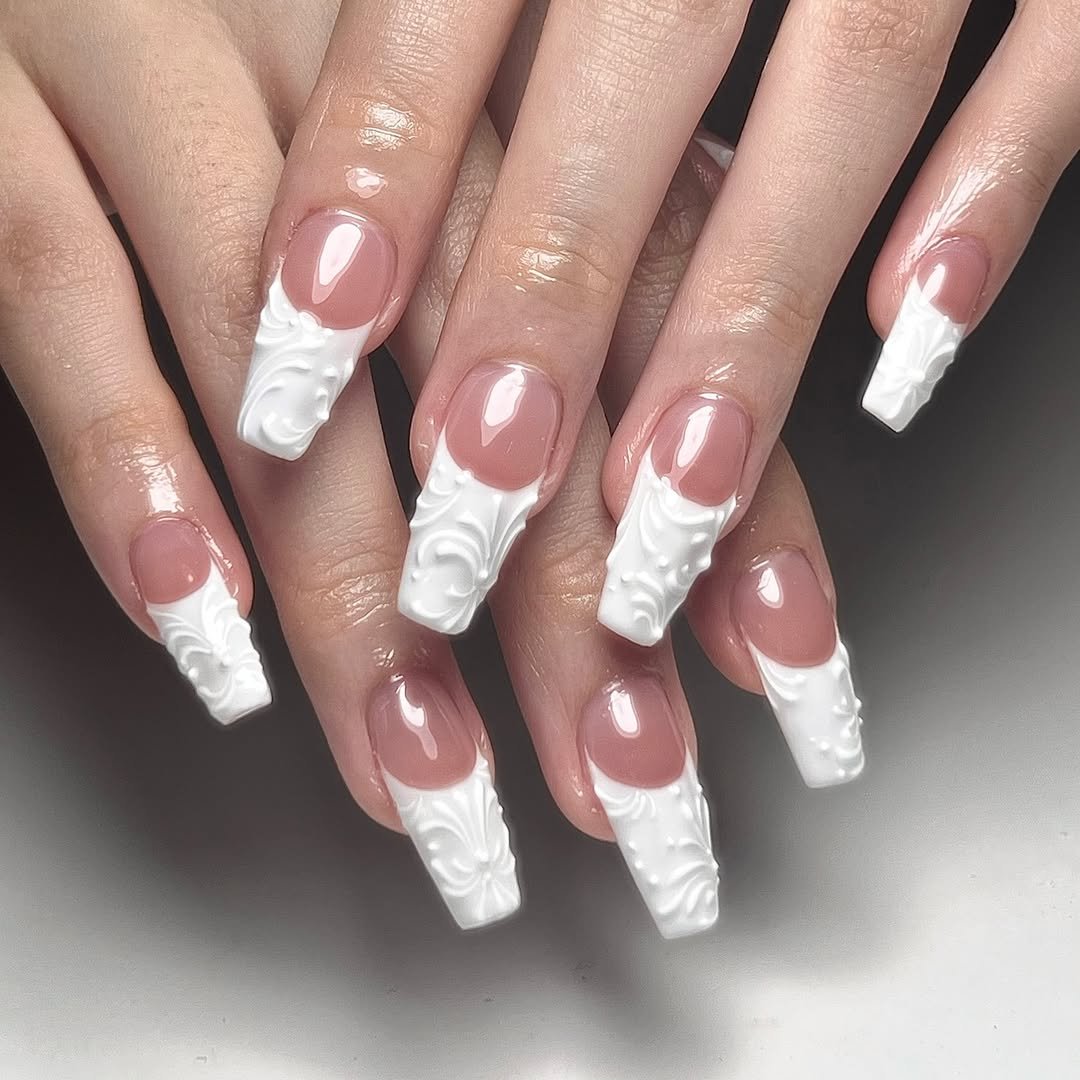 This isn’t your basic French tip—it’s French couture. The crisp white tips are elevated with that raised, embossed swirl detail that almost looks like icing piped onto a cake.