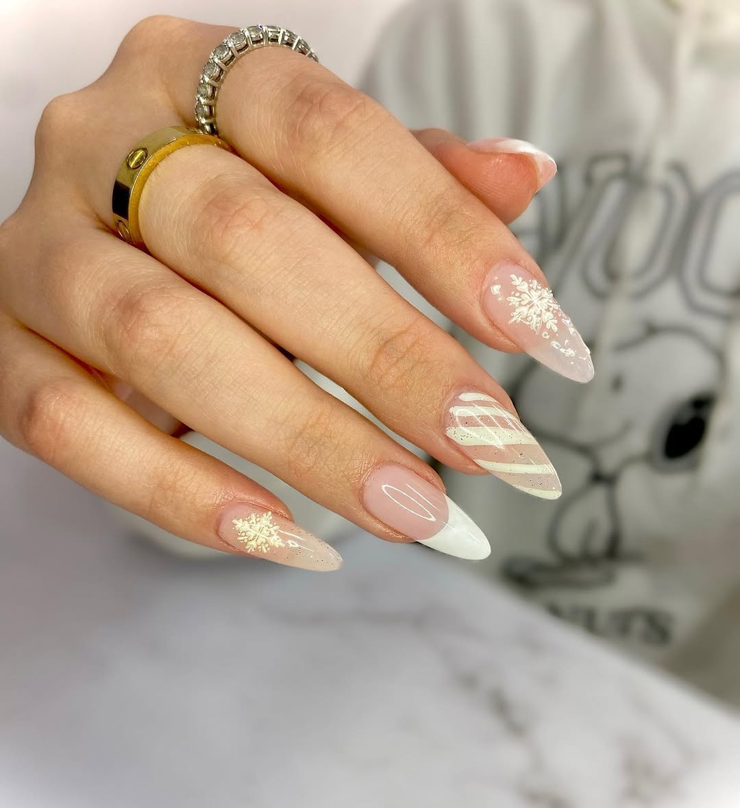 These almond nails blend sheer nude with soft white tips, snowflake accents, and subtle glitter detailing.