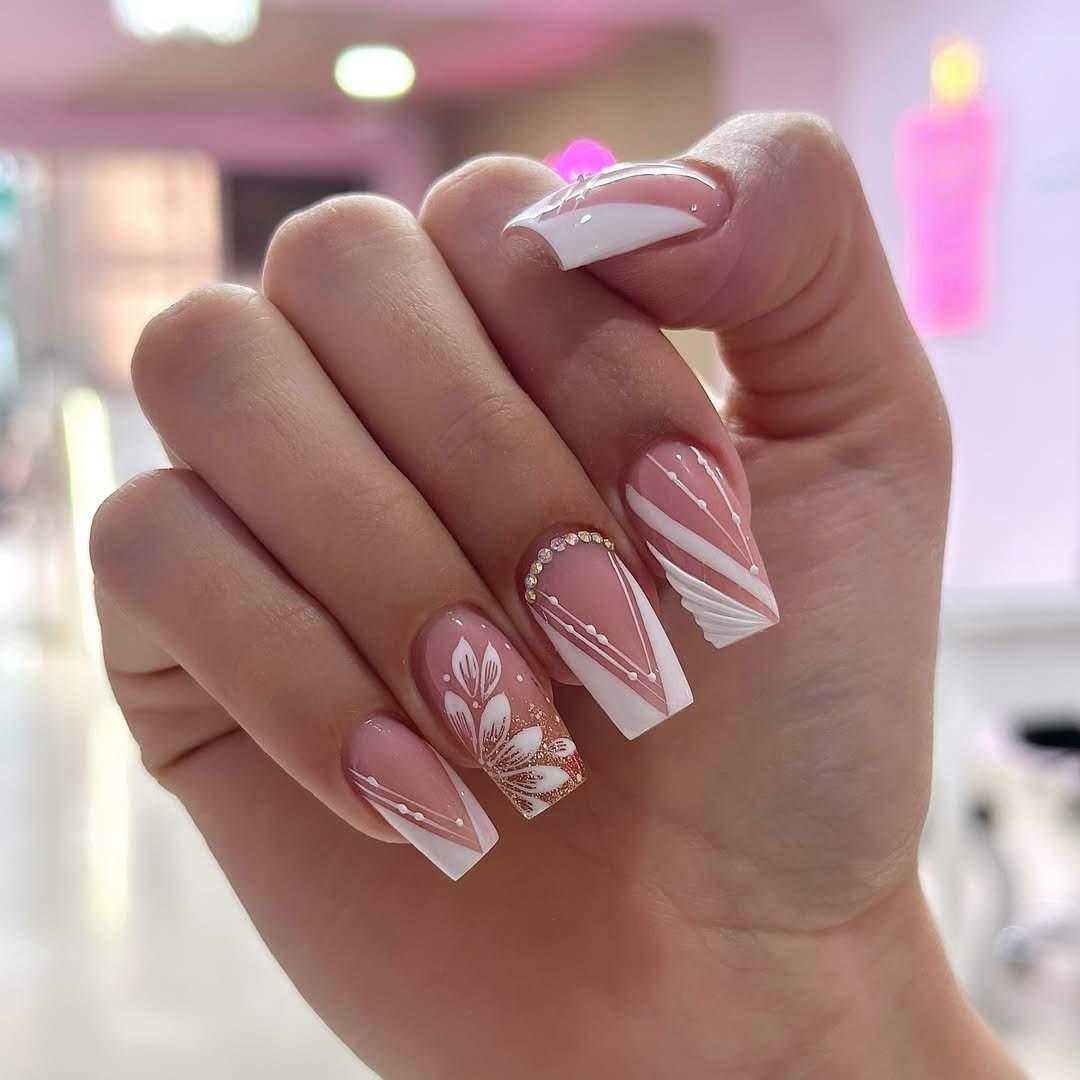 A soft blush base paired with delicate white striping and a floral accent nail makes this set feel romantic but refined.