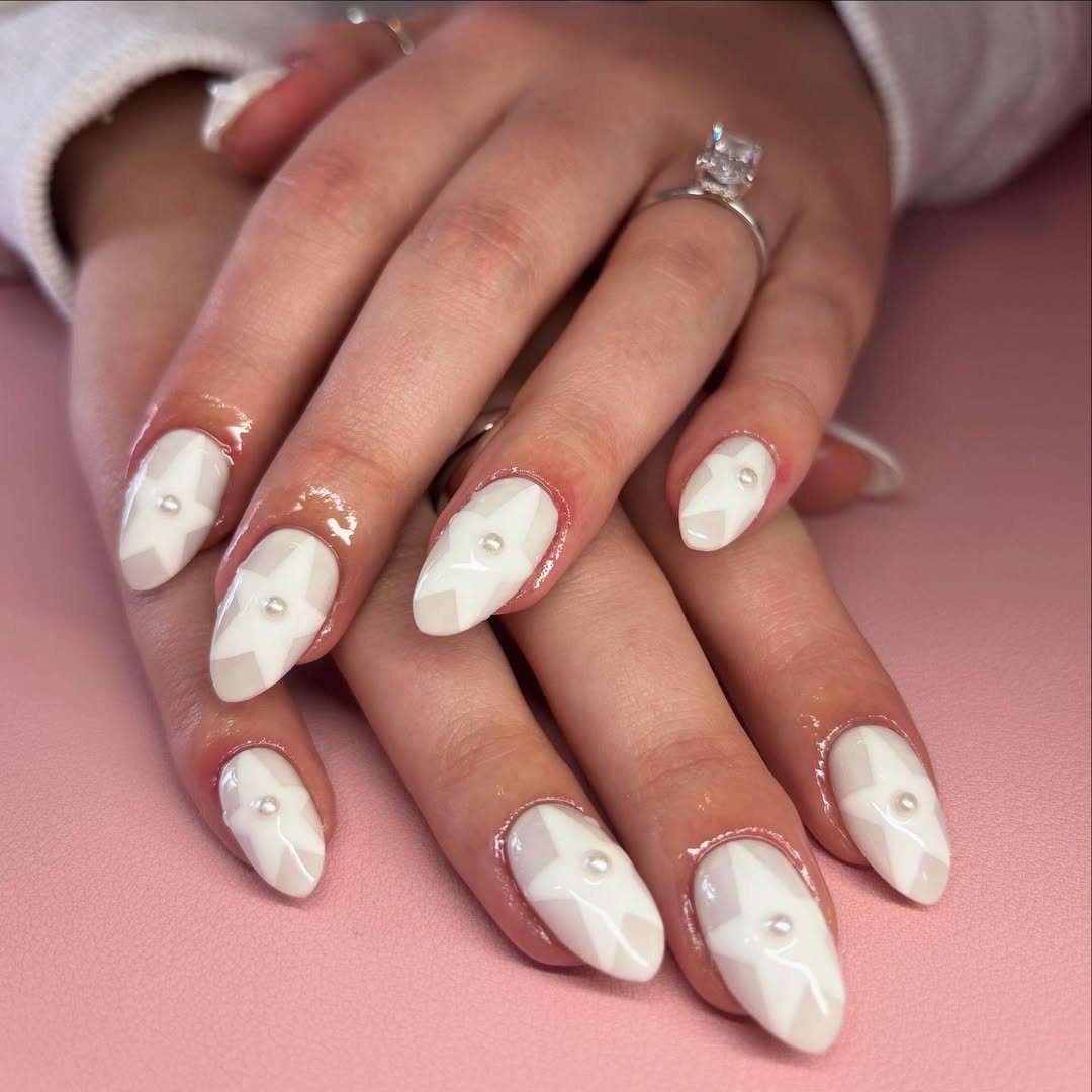 These almond nails feature a milky base with subtle star shapes and tiny pearl centers that catch the light in the sweetest way.