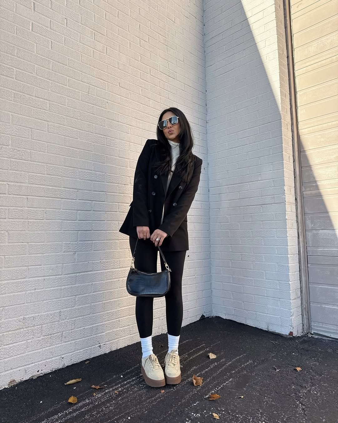 This look keeps things sleek with an all-black base that feels sharp and intentional. The oversized blazer paired with leggings creates a clean silhouette that’s simple but powerful.