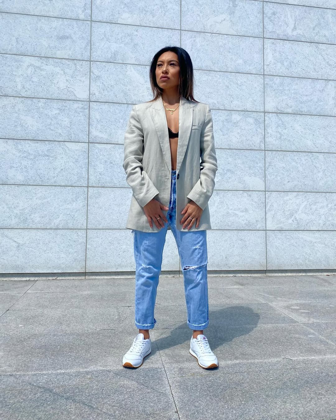 There’s something about pairing structured tailoring with sneakers that always works. The neutral blazer adds sharpness to the outfit, while relaxed denim keeps things feeling approachable.