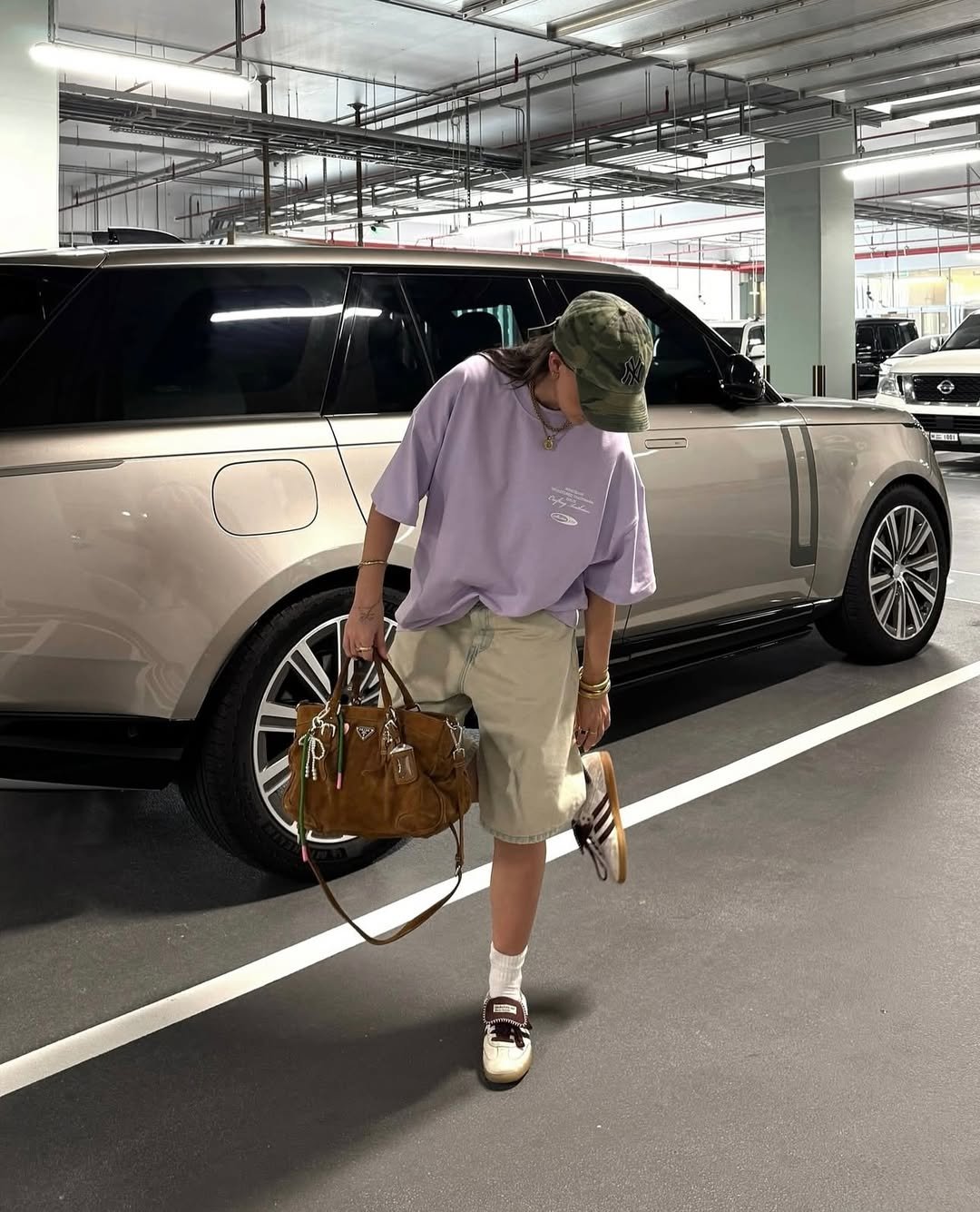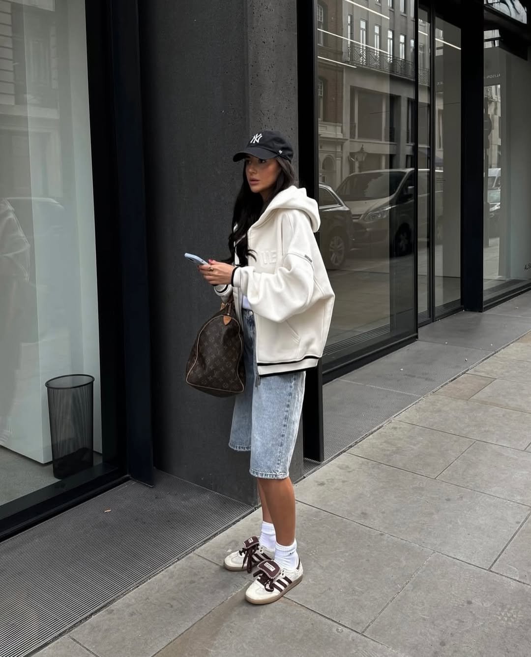 Chunky sneakers complete the vibe perfectly. Add a baseball cap and a designer bag, and suddenly the whole look feels like something you’d spot walking past a café in a cool city neighborhood.