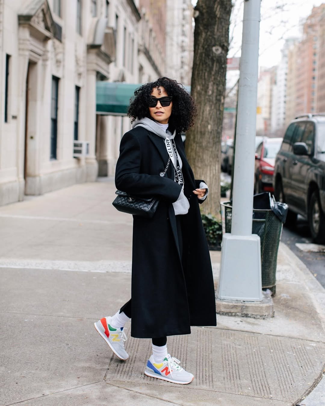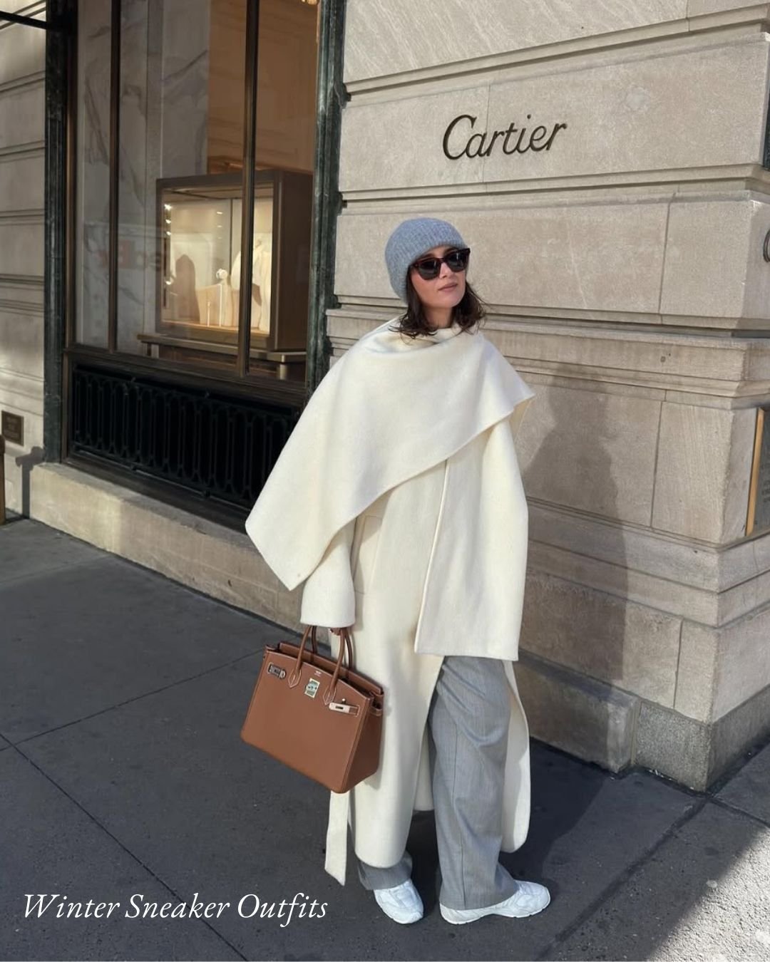 Chunky white sneakers bring the whole look back to street style territory. It’s bold, confident, and exactly the kind of outfit that turns heads on a city sidewalk.