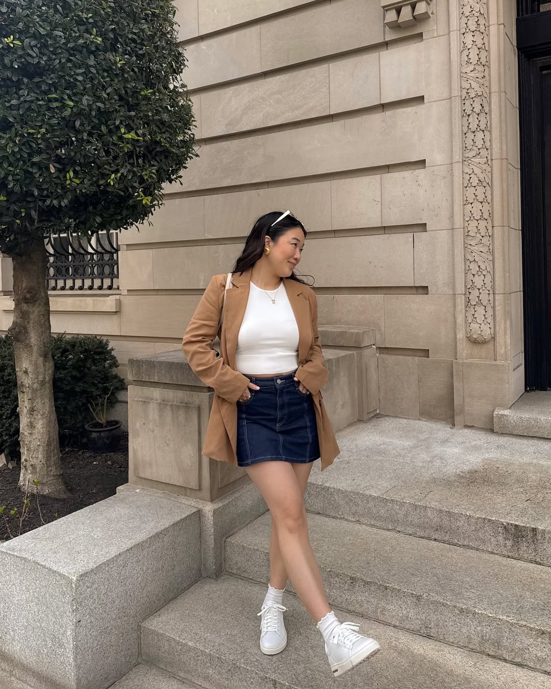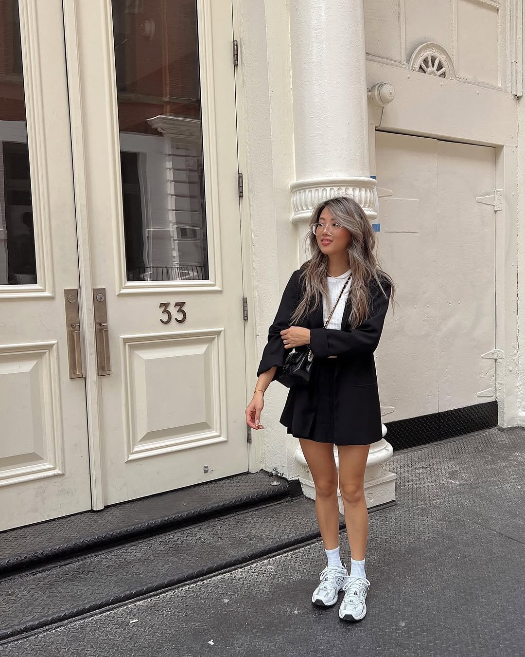 This outfit blends polished and playful so effortlessly. A structured blazer layered over a mini skirt brings that classic city style energy, but the white sneakers keep it feeling fresh and youthful.