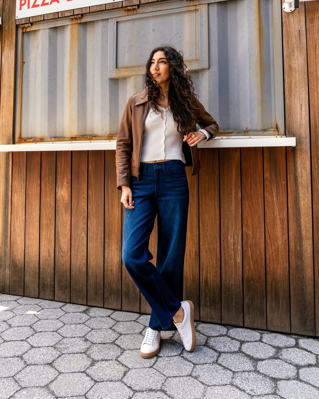 The white sneakers ground the whole outfit without competing for attention. Add a baseball cap and a well-loved leather bag, and suddenly the whole look feels like something you’d spot outside a downtown café.