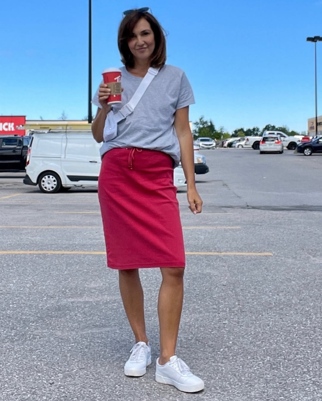 Sometimes the simplest outfits end up being the most wearable. A relaxed grey tee paired with a bright red drawstring skirt instantly feels fun, comfortable, and ready for a busy day out. It’s the kind of look that works for quick errands, a grocery stop, or that inevitable coffee break.