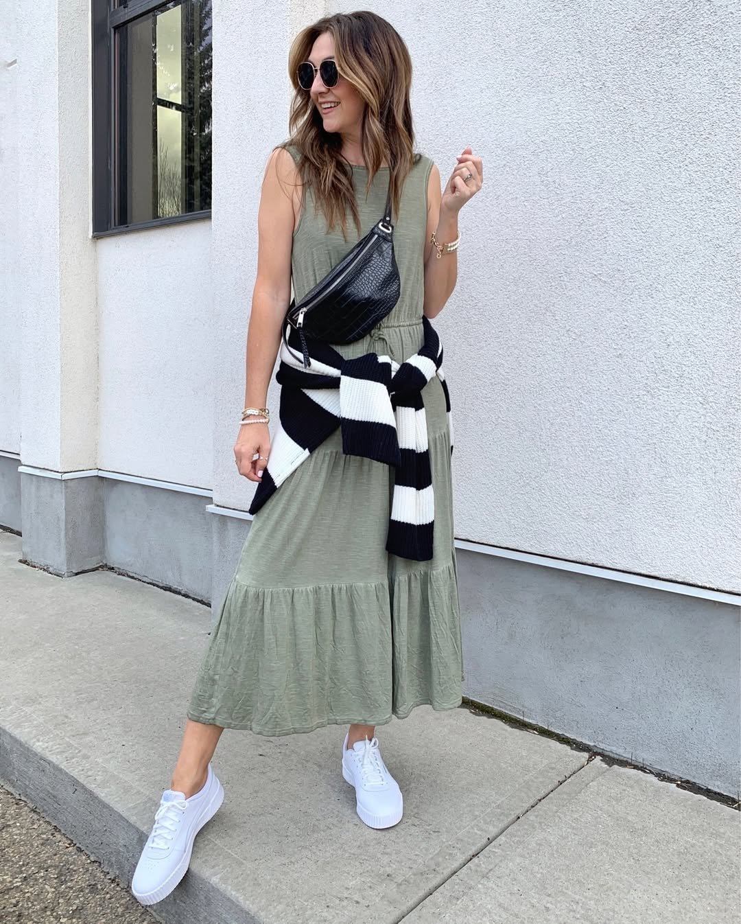 This outfit leans into that soft, relaxed weekend style that never tries too hard. The flowy olive midi dress brings movement and comfort, while the striped sweater tied at the waist adds a casual, layered touch.