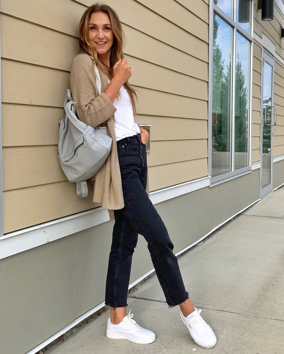 The white sneakers tie everything together with that clean, fresh finish. They keep the outfit relaxed while the neutral layers add a little warmth and texture. Proof that simple staples can still feel quietly stylish.