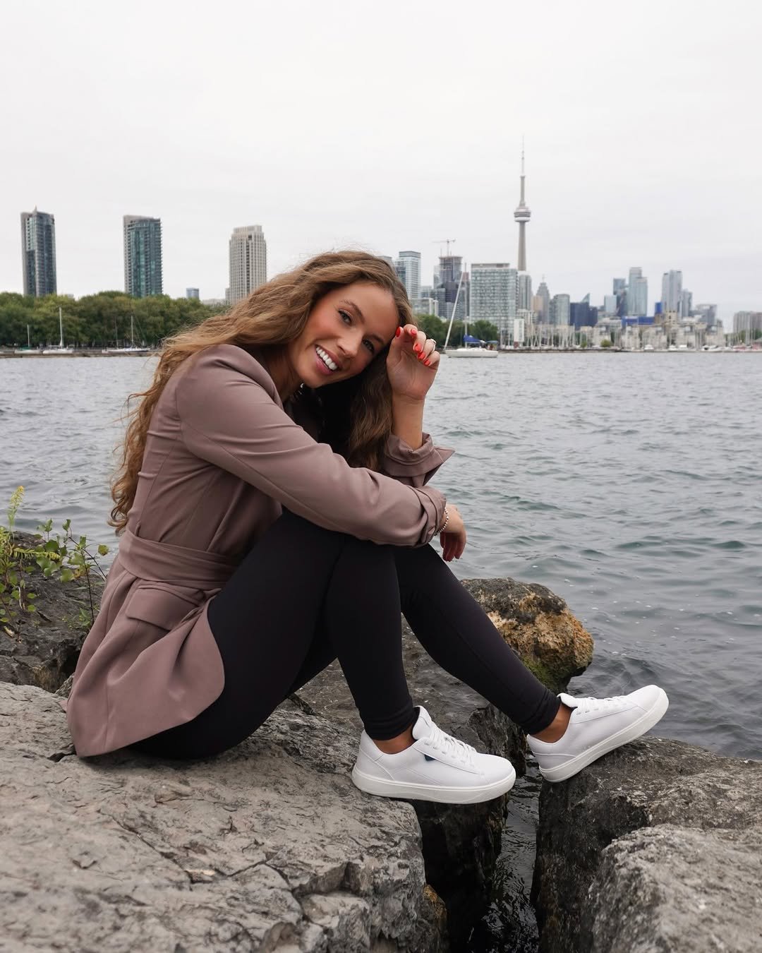 The white sneakers keep everything grounded and practical, especially for a stroll along the waterfront. It’s a look that says effortless city style without trying too hard.