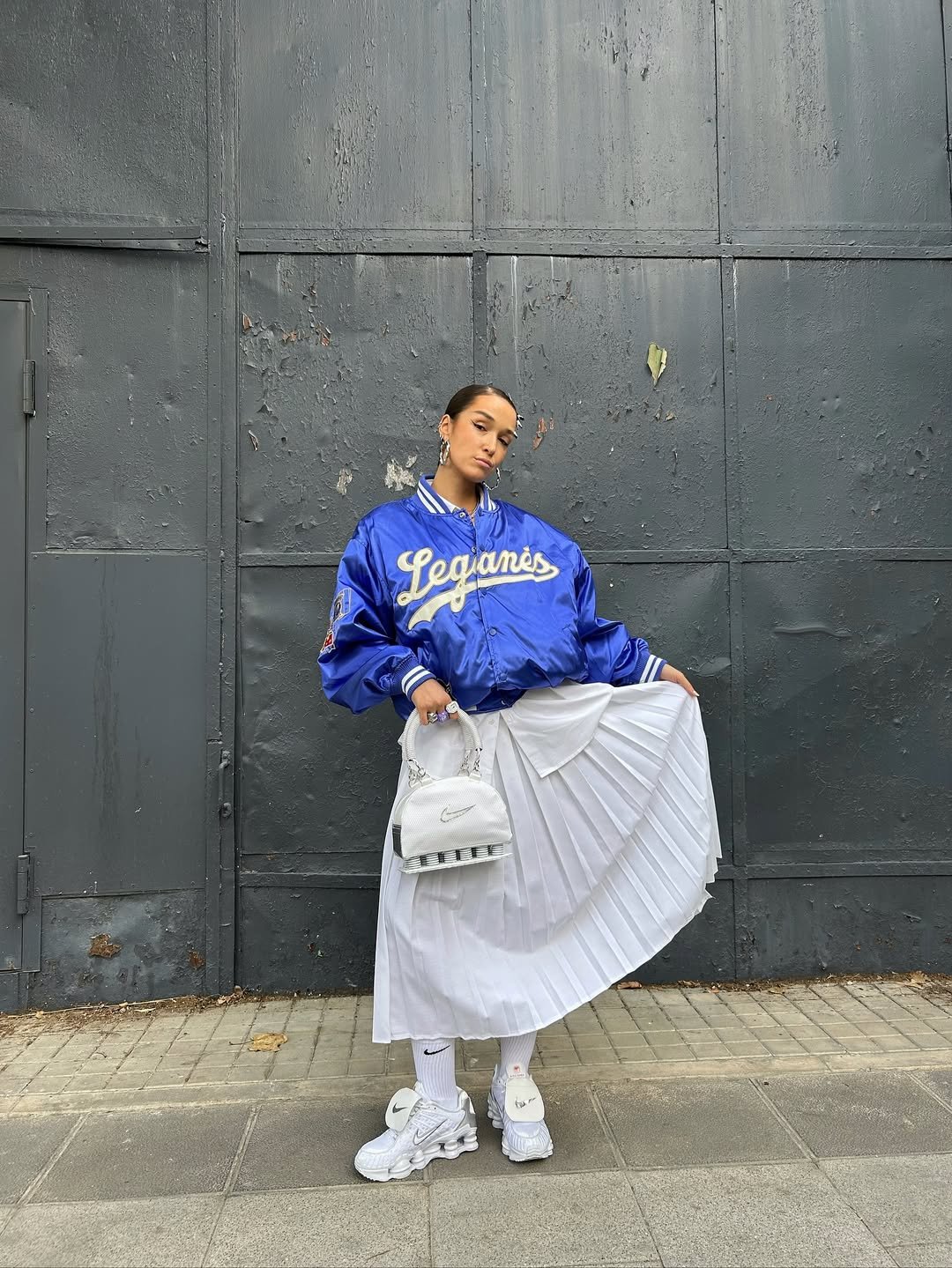 This outfit is all about contrast and personality. The bold varsity jacket layered over a crisp white pleated skirt creates a playful mix of sporty and feminine.