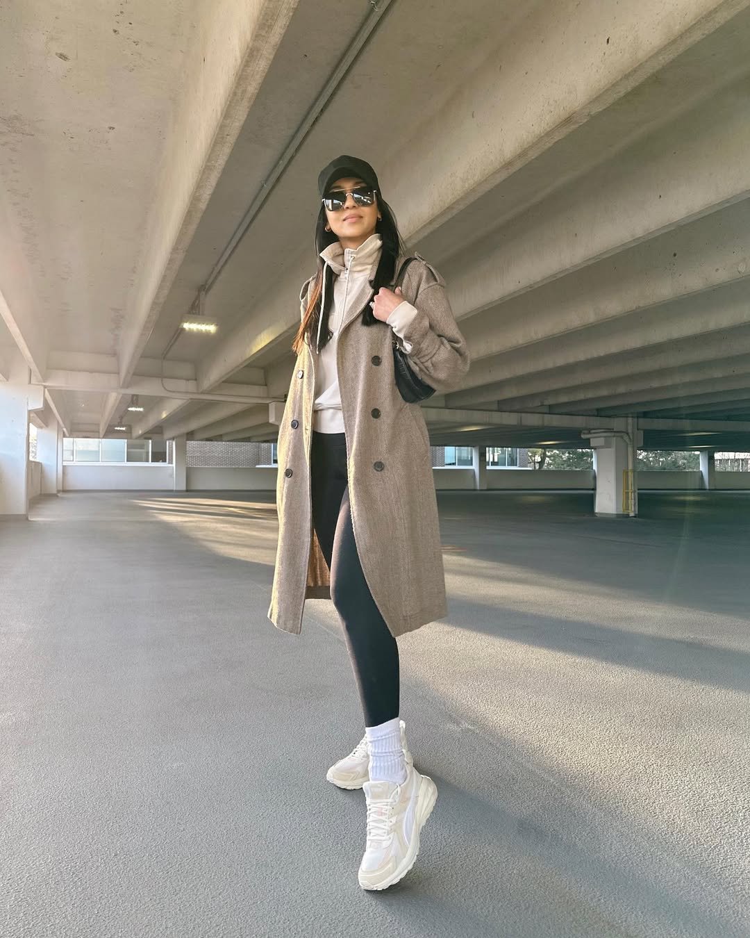 This look leans into modern athleisure with a polished twist. The long neutral coat layered over leggings and a zip-up adds structure, turning simple workout staples into something that feels city-ready.